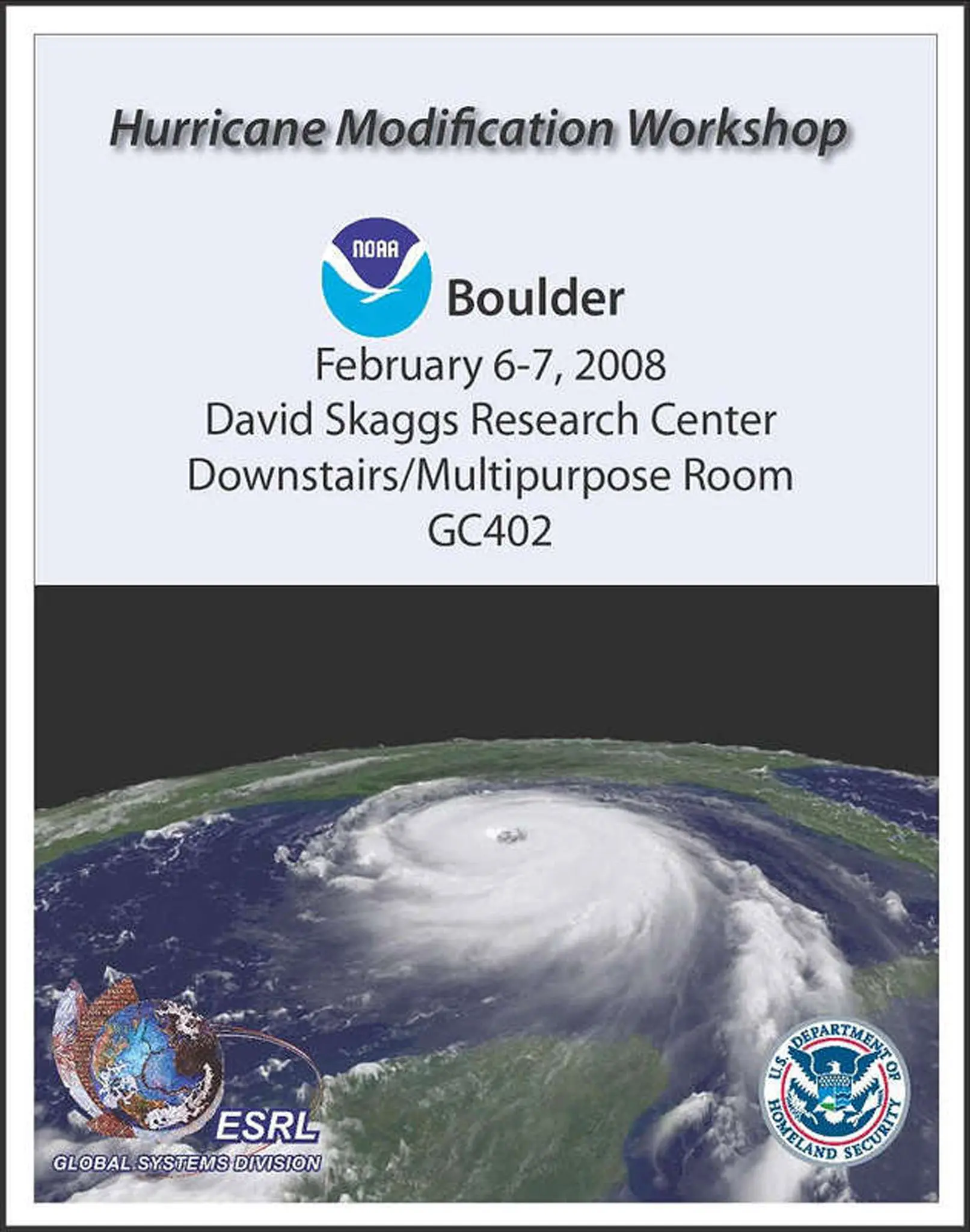In view of these realities, the Department of Homeland Security (DHS) with the organizational assistance of the National Oceanic and Atmospheric Administration (NOAA)/Global Systems Division of the Earth Systems Research Laboratory sponsored a workshop on hurricane modification at the David Skaggs Research Center in Boulder, Colorado February 6-7, 2008. This action is consistent with the Homeland Security Act of 2002, the Department of Homeland Security (DHS) mission to respond to threats and hazards to the nation and the Science and Technology Directorate (S&T) goal to accelerate delivery of enhanced technological capabilities to meet requirements and fill capability gaps to support DHS agencies in accomplishing their mission. The focus of the workshop was to: